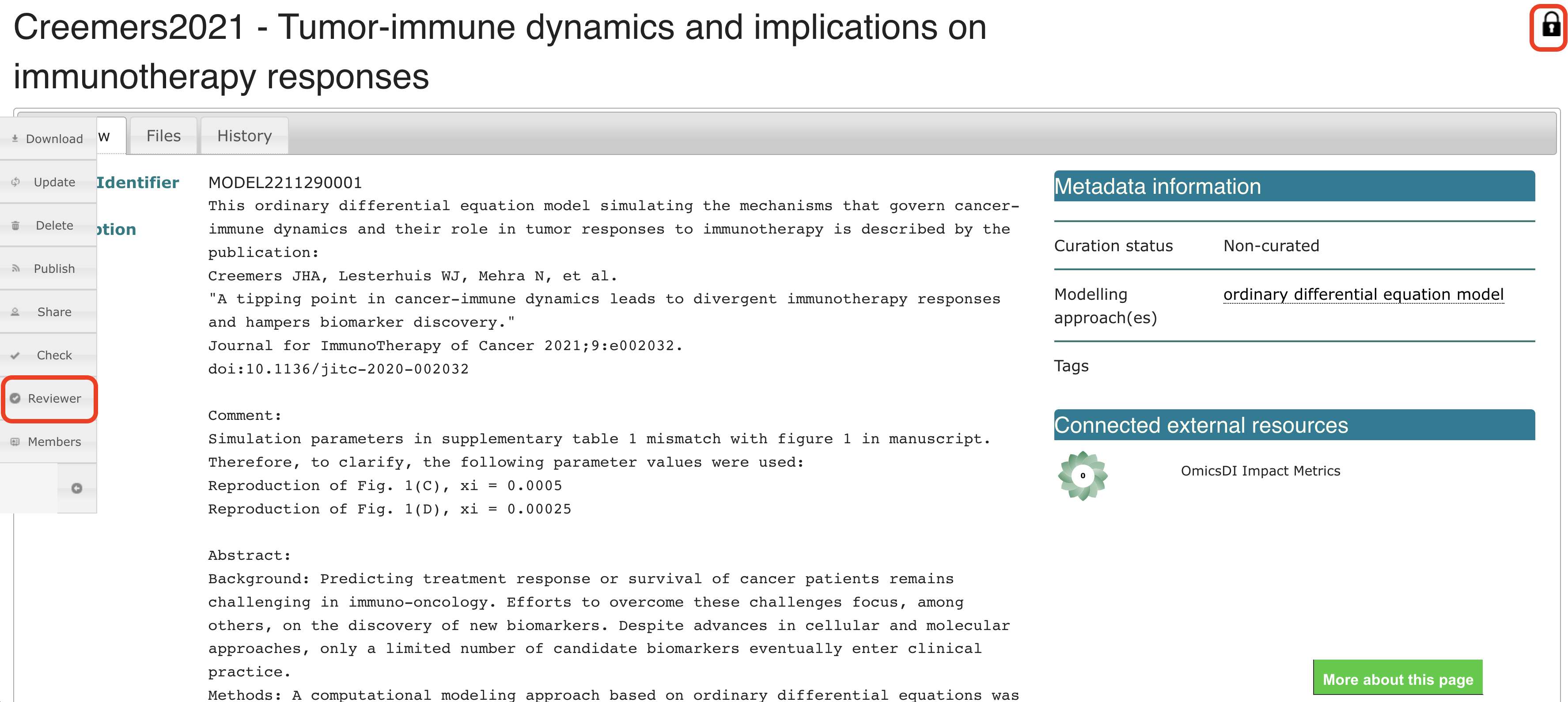 When opening an unpublished model, the Reviewer button can be found on the model toolbox (see Fig. 1) which lets the submitter request a reviewer account for the model in question. BioModels will create a new account immediately to provide with read access to the model.